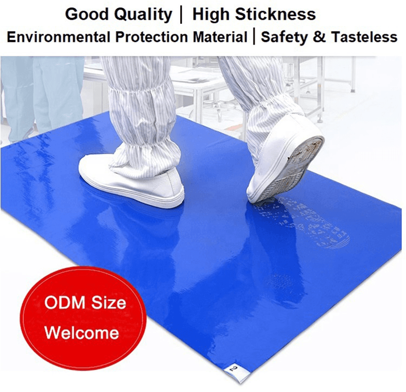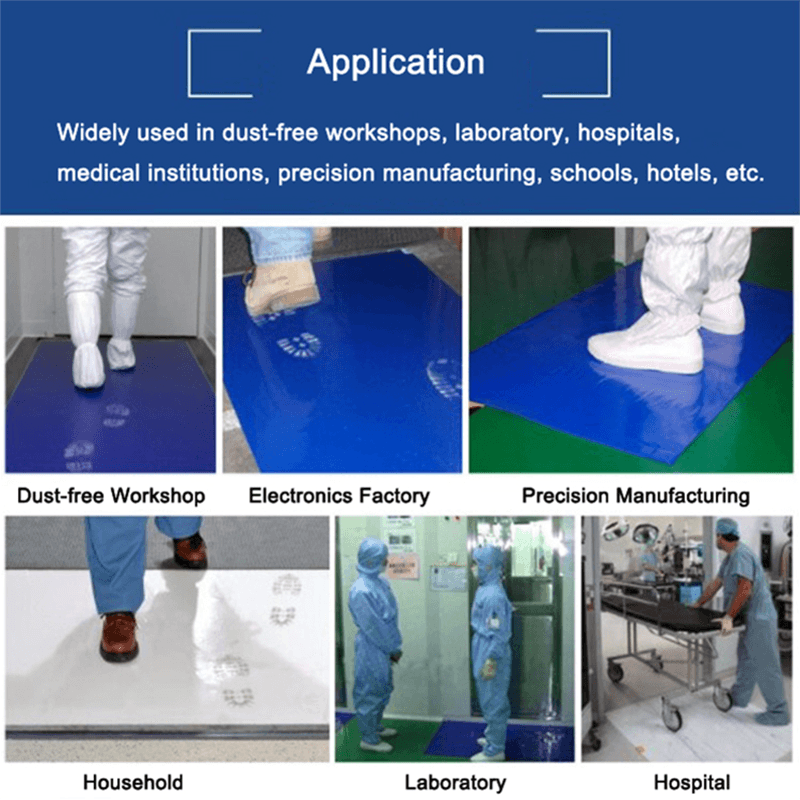 الغرفة النظيفة: في بيئة غرفة نظيفة ، من الأهمية بمكان الحفاظ على نظافة الأرضية. يمكن أن تلتقط الحصير اللزجة بشكل فعال الملوثات من باطن العجلات من الأحذية وعجلات المعدات ، مما يساعد على الحفاظ على معايير النظافة للبيئة وضمان تشغيل عملية الإنتاج الخالية من الغبار.